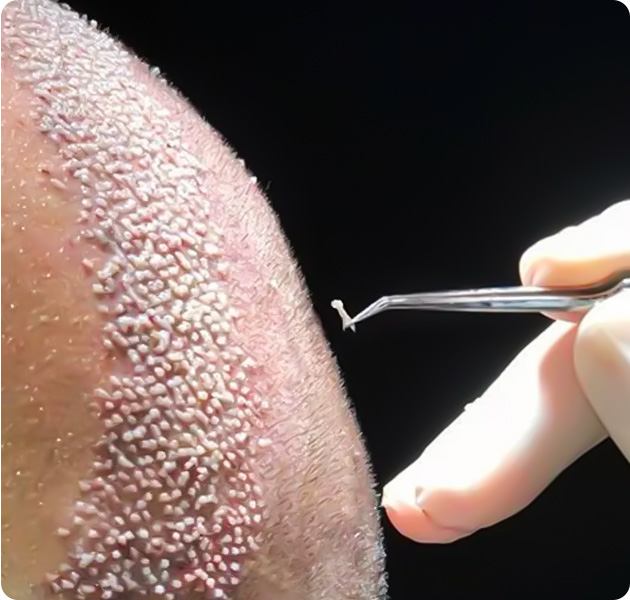 Transplantasyon sırasında saç köklerine zarar vermemek, kökü doğru noktadan tutmak ve tek hamlede kanala yerleştirmek için azami dikkat gösterilir.