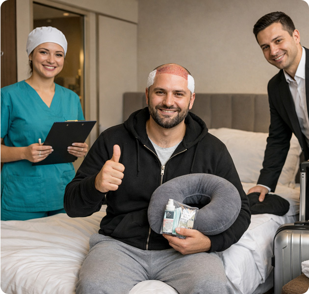 Hasta ertesi gün kontrole gelmek üzere taburcu edilir. Kliniğimizde, rahat uyku sağlanması ve ekim bölgesinin korunması amacıyla özel tasarlanmış bir yastık temin edilir.